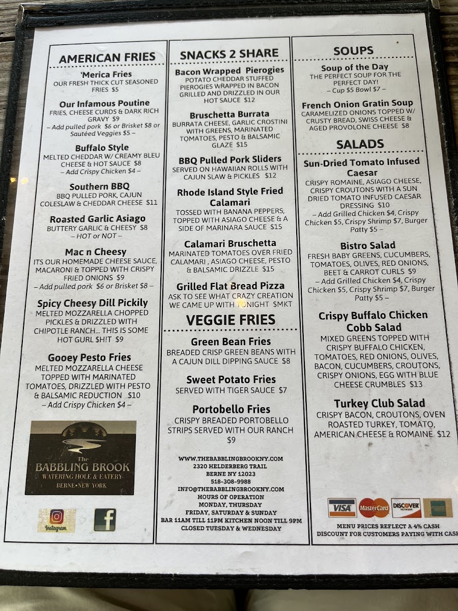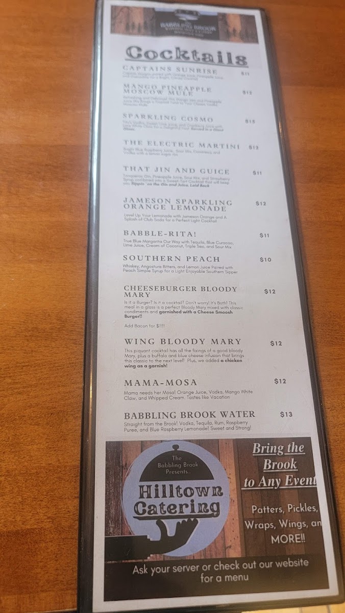Welcome to The Babbling Brook Watering Hole & Eatery, a hidden gem nestled in Berne, NY, where delightful dishes meet a picturesque setting. The menu blends comfort and creativity, offering highlights like the hearty Bad Boy Burger and the indulgent Lobster Roll, celebrated for their robust flavors and fresh ingredients. Don't miss the unique Maui Wowie Wrap or the savory Marinated Pork Tenderloin.